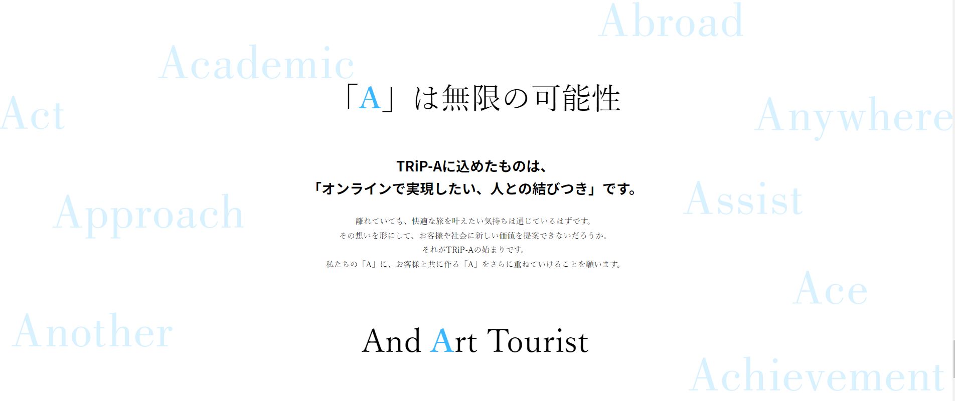 NEWSお知らせ オンライン旅行予約サイト TRiP-Aをリリースしました 2022.07.19 お知らせ この度、オンライン旅行予約サイト「TRiP-A(トリップエー)」をリリースいたしました。 京都で35年、大学や研究機関の研究者の皆さまに業務渡航手配を行っている株式会社アートツーリストが運営しています。 「コロナ禍での海外出張が不安」 「いざという時にしっかりしたサポートがあると安心」 そのようなお声にお応えして、オンライン予約でもお客様とのコミュニケーションを重視した、「人が見える」サイト運営を行ってまいります。 皆さまのご利用をスタッフ一同心よりお待ちしております。 次の記事へ アーカイブ 2026年1月 2025年12月 2025年11月 2025年10月 2025年9月 2025年8月 2025年7月 2025年6月 2025年4月 2025年2月 2025年1月 2024年12月 2024年11月 2024年10月 2024年9月 2024年8月 2024年7月 2024年6月 2024年4月 2024年1月 2023年12月 2023年8月 2023年7月 2023年5月 2023年4月 2023年3月 2023年1月 2022年12月 2022年11月 2022年10月 2022年9月 2022年8月 2022年7月