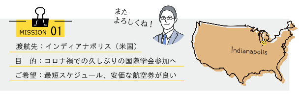 リョウマ:リピーターの先生からのご依頼で、インディアナポリス行きの航空券をご提案するところですね。