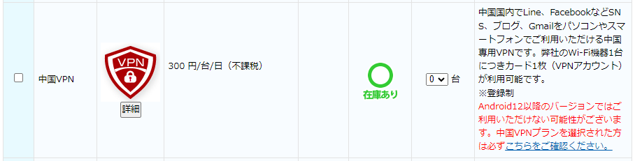 プラン選択後、オプションから「中国VPN」を追加しましょう。お申込みはこちら