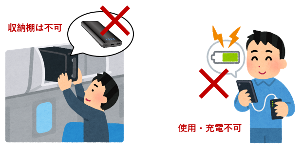 モバイルバッテリーを座席上の収納棚に収納しないこと。