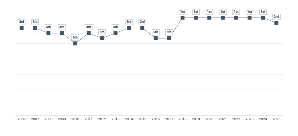 7位:185カ国 オーストラリア、チェコ、ハンガリー、マルタ、ポーランド